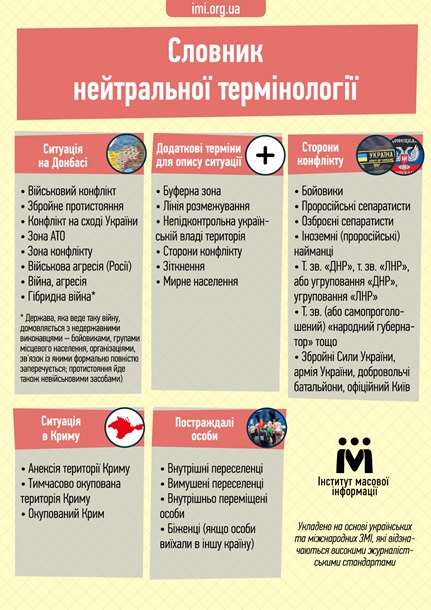 Украинский Институт массовой информации опубликовал "Словарь нейтральной терминологии", которым могут пользоваться журналисты при освещении событий в Донбассе.